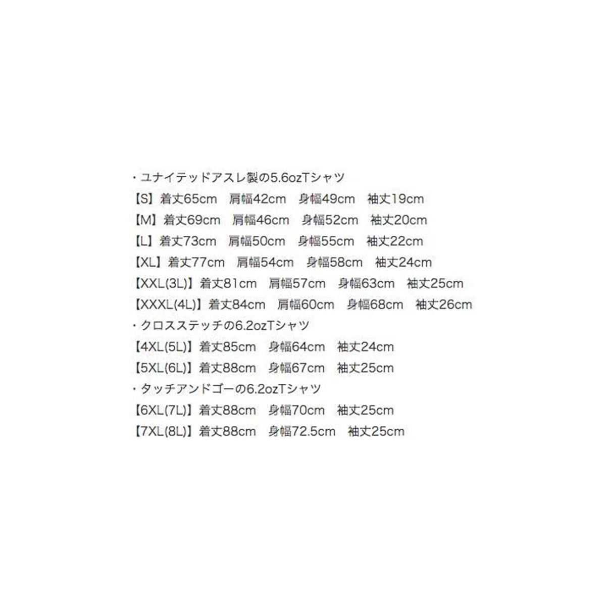 S〜XXXLまでがアスレ製の5.6ozTシャツ、4XL(5L)と5XL(6L)がクロスステッチまたはタッチアンドゴーの6.2ozTシャツ、6XL(7L)と7XL(8L)がタッチアンドゴーの6.2ozTシャツとなります。